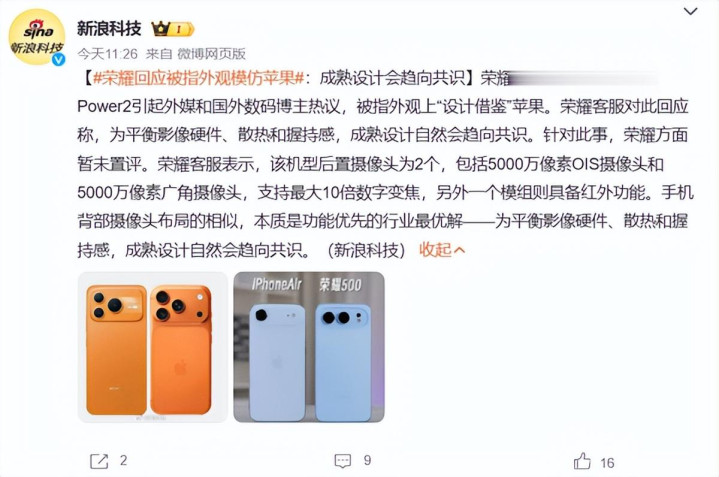 据国内媒体报道,荣耀客服对此回应称,为平衡影像硬件、散热和握持感,成熟设计自然会趋向共识。