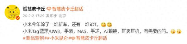 {jz:field.toptypename/}此外,小米今年还会推出小米Tag蓝牙/UWB、手表、Ai眼镜、耳夹耳机等IoT产品,新品大爆发。