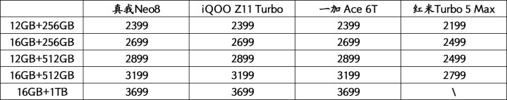 价格无疑是红米Turbo 5 Max最大的杀手锏,其起售价2199元,比一加Ace 6T的起售价要便宜200元,更狠的是在512GB版本上面,红米Turbo 5 Max比一加Ace 6T便宜400元,对于2K档位的性能机来说,这个差价的杀伤力就不用多说了。