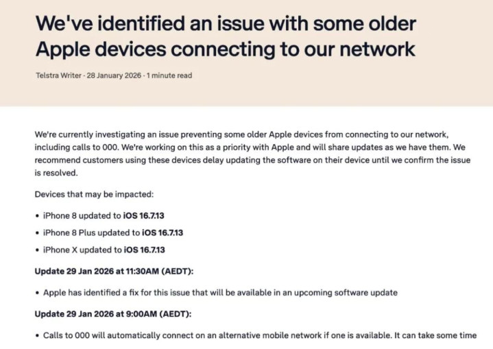 据澳大利亚运营商 Telstra 发文表示,正与苹果合作解决此问题,建议使用旧设备的 iPhone 机型暂缓升级。