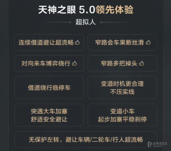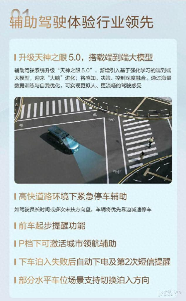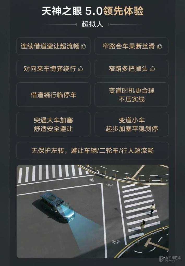 而顶配版车型则搭载天神之眼B-辅助驾驶激光版(顶配),配备英伟达Orin-X芯片(算力254 TOPS),并新增1颗激光雷达,共计30个智能传感器,支持城市领航辅助驾驶、全场景智能泊车等功能。