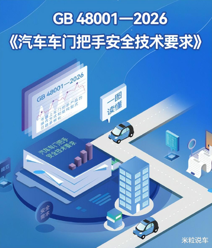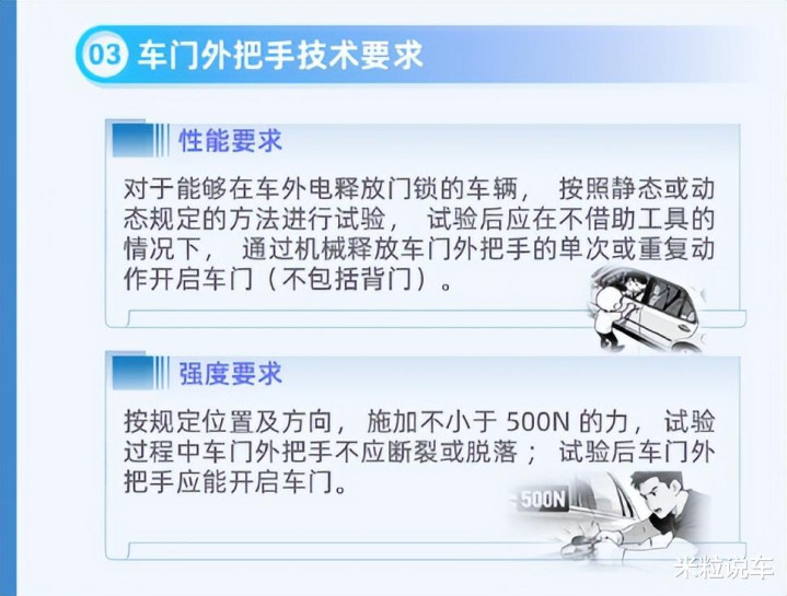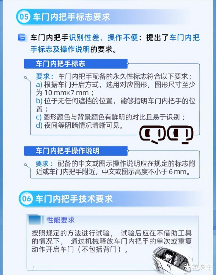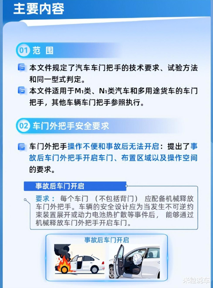 后来一些车企也采用了在新车内部设置紧急机械打开门把手的设计,但是终归治标不治本!所以在这种背景之下,工业和信息化组织制定了强制国家标准《汽车门把手安全技术要求》,并且将会在2027年1月1号正式实施。