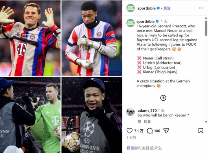 诺伊尔因小腿受伤而休战,瞻望将在国外比赛日之后复出。他的替补乌尔比希上周在客战亚特兰大的比赛中遭遇脑震撼,被动离场,随后周六对阵勒沃库森的比赛由乌尔赖希顶替出场。但是,乌尔赖希在那场比赛中大腿内收肌扯破。此外,19岁的莱昂·克拉纳奇也因大腿受伤无法出战,因此普雷斯科特成为了证明组的首选,乐鱼体育他将与19岁的扬尼斯·巴特尔(拜仁二队门将)竞争出场契机。