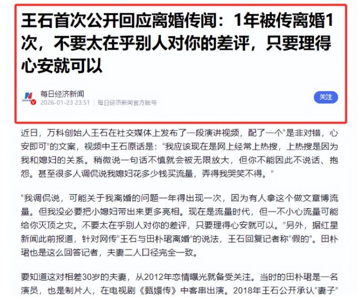 前些日子,网络上关于王石和田朴珺夫妇婚变的传闻沸沸扬扬,各种猜测甚嚣尘上。
