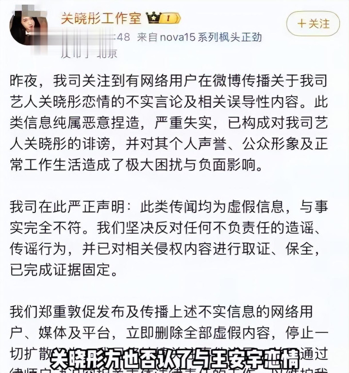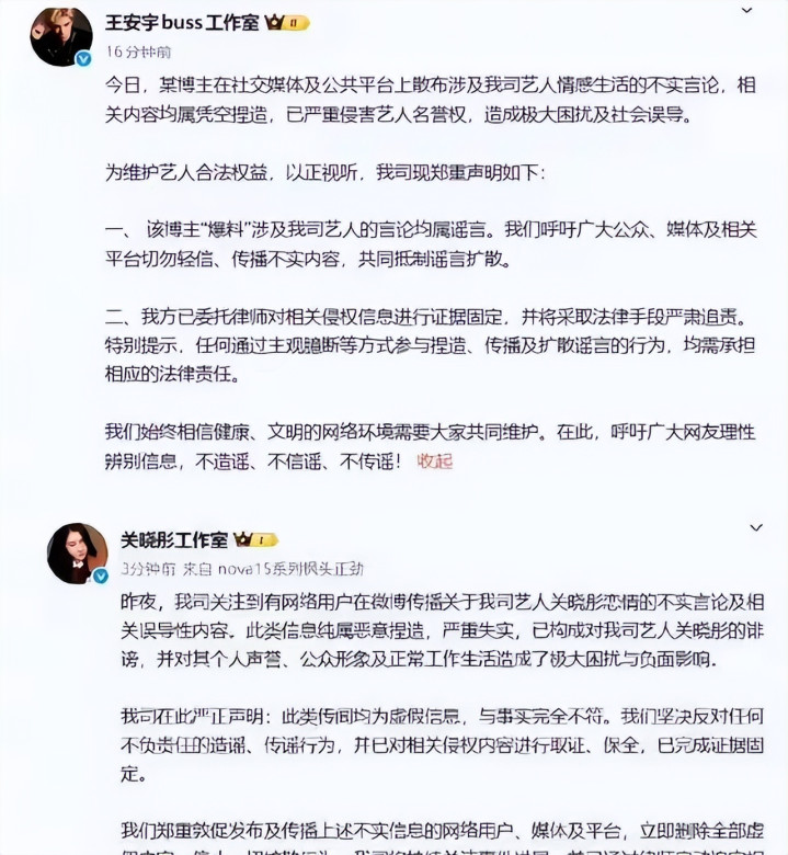 但这事真正的分水岭,是工作室下场那一下,王安宇工作室把话说得很硬,直接定性“相关内容均属凭空捏造”,关晓彤工作室也同步否认,强调是“恶意捏造、严重失实”。