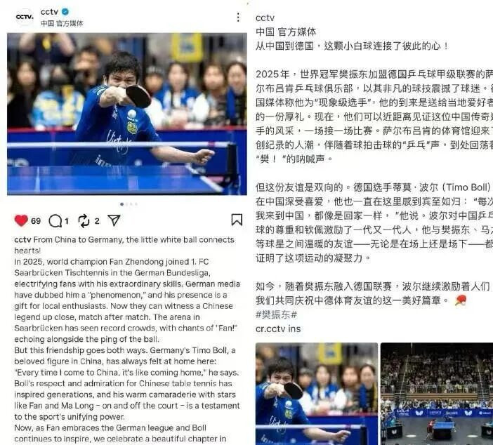 是以,当不少东谈主合计樊振东是阿谁让时代外流、忘本、不爱国、为了收成什么都作念的通顺员时,他已登上CCTV官方账号,并笃定了他”谱写中德友谊好意思好篇章“的业绩。