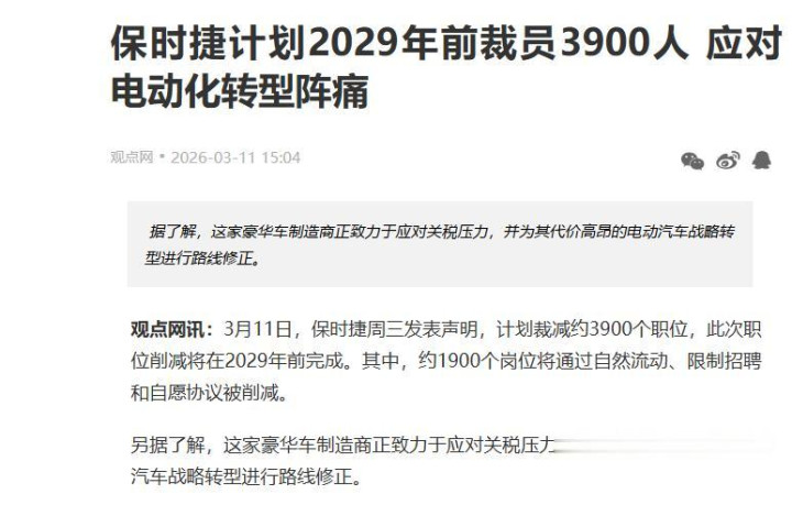 参考信源:保时捷狡计2029年前裁人3900东说念主 应付电动化转型阵痛 - 不雅点网