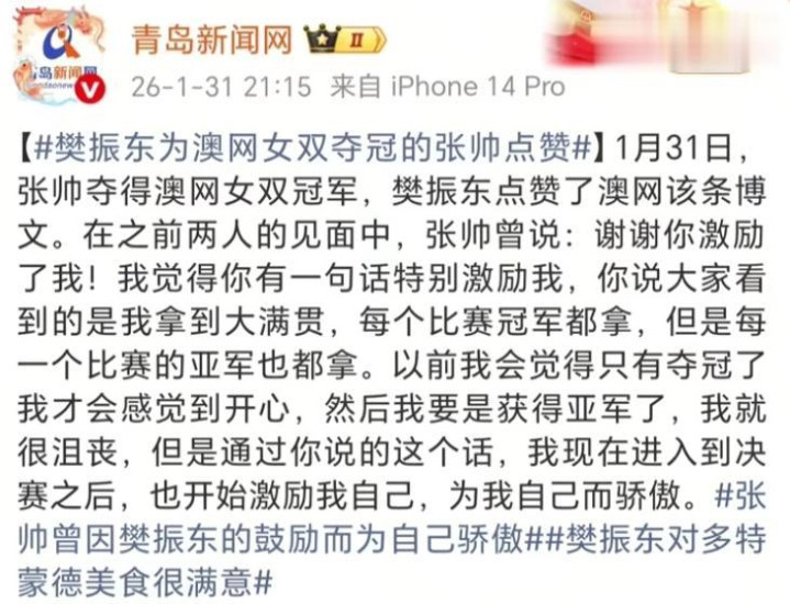 他点赞了澳网发布的祝贺张帅夺冠的动态。