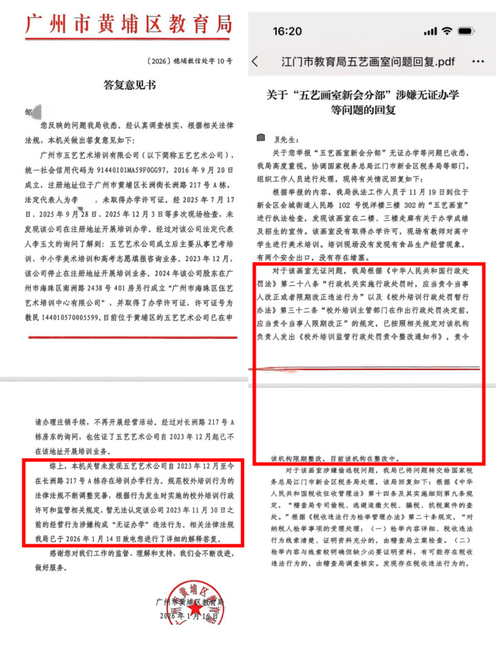 邹先生举报五艺画室涉嫌违规办学,广州黄埔区教育局、江门新会区教育局曾作出答复