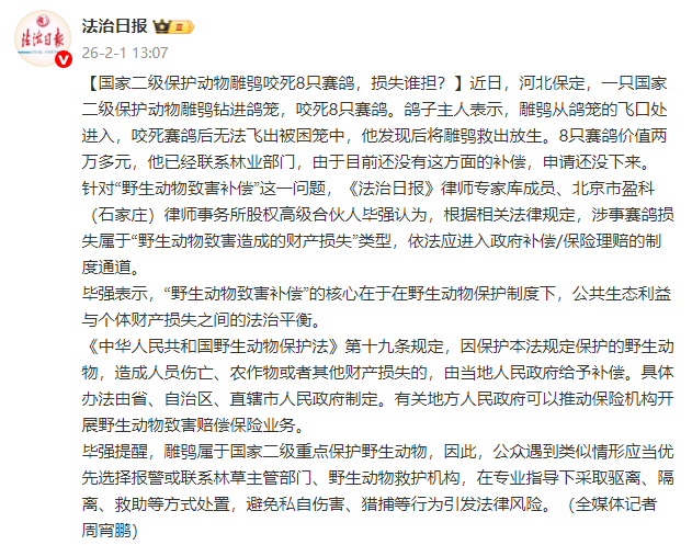 针对“野生动物致害补偿”这一问题,《法治日报》律师专家库成员、北京市盈科(石家庄)律师事务所股权高级合伙人毕强认为,根据相关法律规定,亚搏手机app下载涉事赛鸽损失属于“野生动物致害造成的财产损失”类型,依法应进入政府补偿/保险理赔的制度通道。
