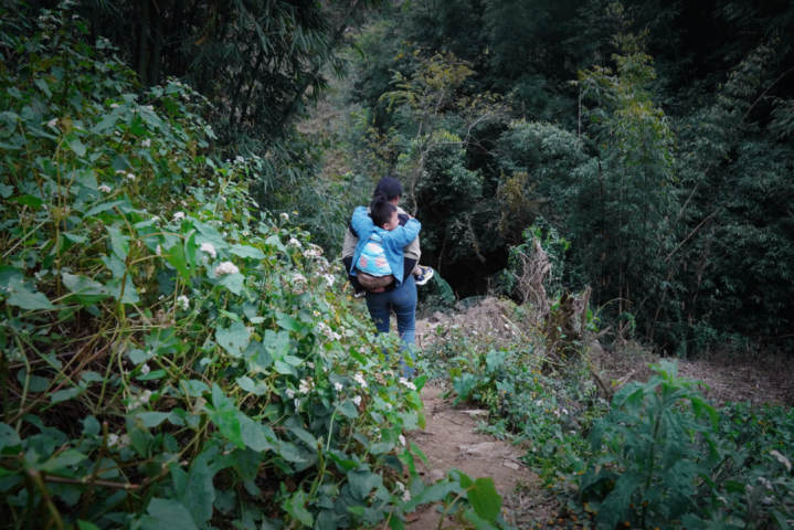 为了赶时间,她不得不绕行两公里崎岖山路,再到屯里的班车站搭车。“下山还算好,回程时还要带上奶粉和纸尿裤,路就更难走了。”唐彩芬说。