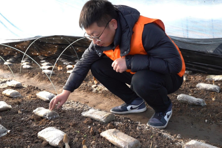 平安农险人员陈恒威查看羊肚菌营养包吸收情况蒋飞/摄影