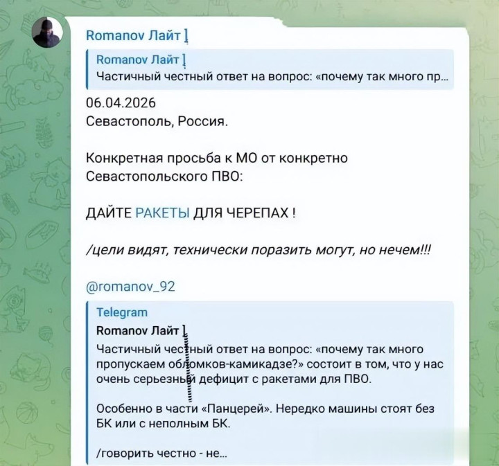 俄罗斯着名军事博主罗曼诺夫在外交媒体上公开暗示,俄军防空系统当今严重零落导弹,尤其是“铠甲”防空系统,“塞瓦斯托波尔防空司令部向国防部建议明确申请:给咱们提供说念尔/铠甲导弹!咱们能看到指标,表面上也有才调击中它们,但咱们却一无扫数!!!”
