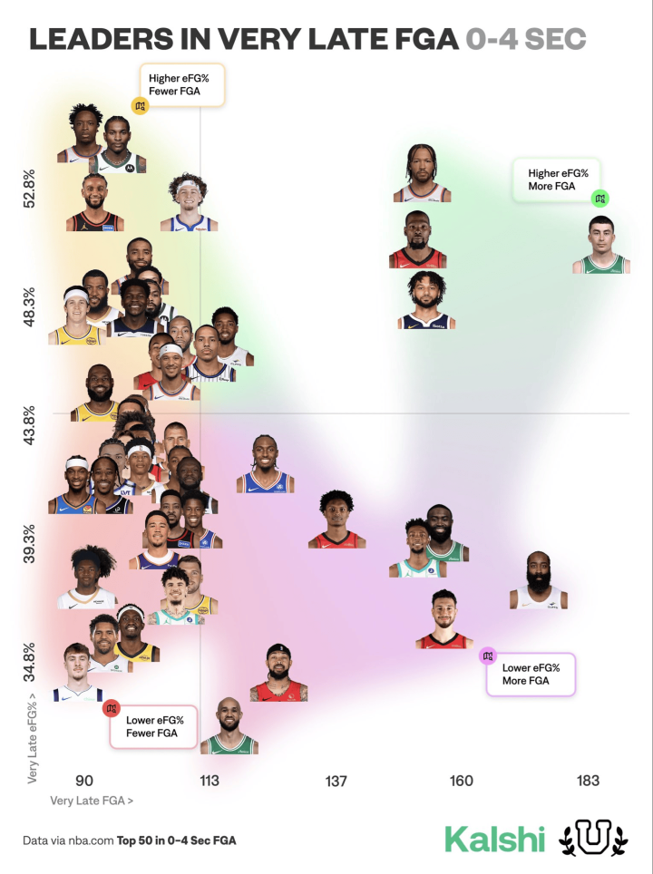 虎扑04月08日讯好意思媒BasketballUniversity共享数据:本赛季还剩0-4秒拆弹投篮数据。