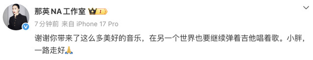 那英通过工作室微博表达悼念:“谢谢你带来了这么多美好的音乐,在另一个世界也要继续弹着吉他唱着歌。小胖,一路走好”