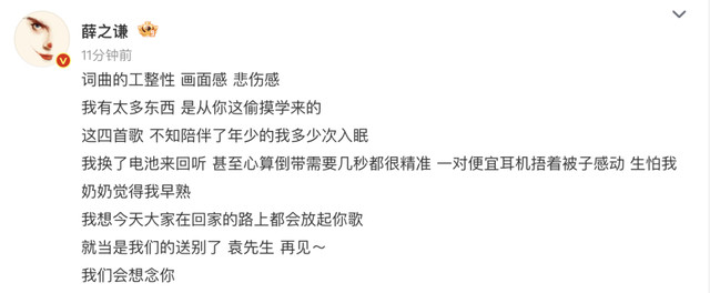 歌手薛之谦分享了袁惟仁作词作曲的《梦醒了》《征服》《勇敢一点》《离开我》,表示“这四首歌不知陪伴了年少的我多少次入眠”,“词曲的工整性、画面感、悲伤感……我有太多东西是从你这偷摸学来的!”