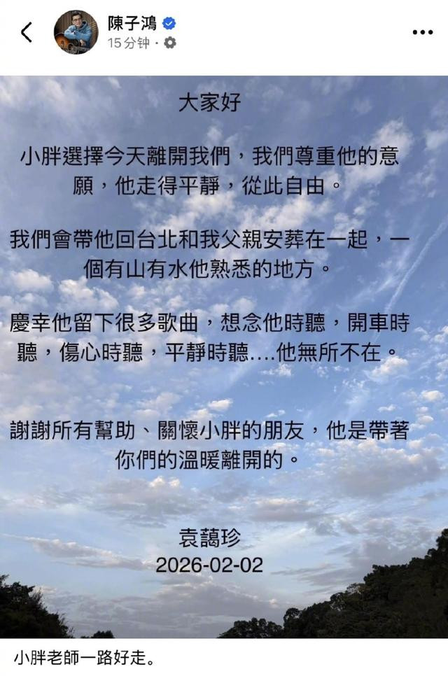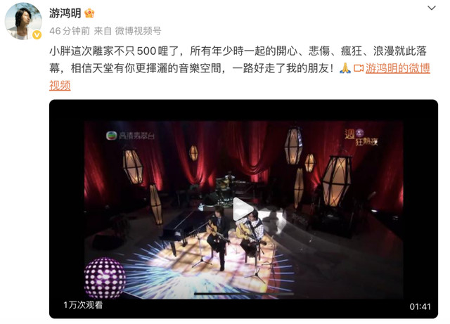 歌手游鸿明晒出两人昔日的合作画面,引用共同创作的《离家500里》歌词表达悼念:“小胖这次离家不只500里了,所有年少时一起的开心、悲伤、疯狂、浪漫就此落幕,相信天堂有你更挥洒的音乐空间,一路好走了我的朋友。”