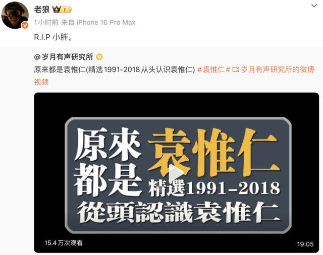 歌手老狼转发了网友制作的袁惟仁作品集锦:“R.I.P小胖。”
