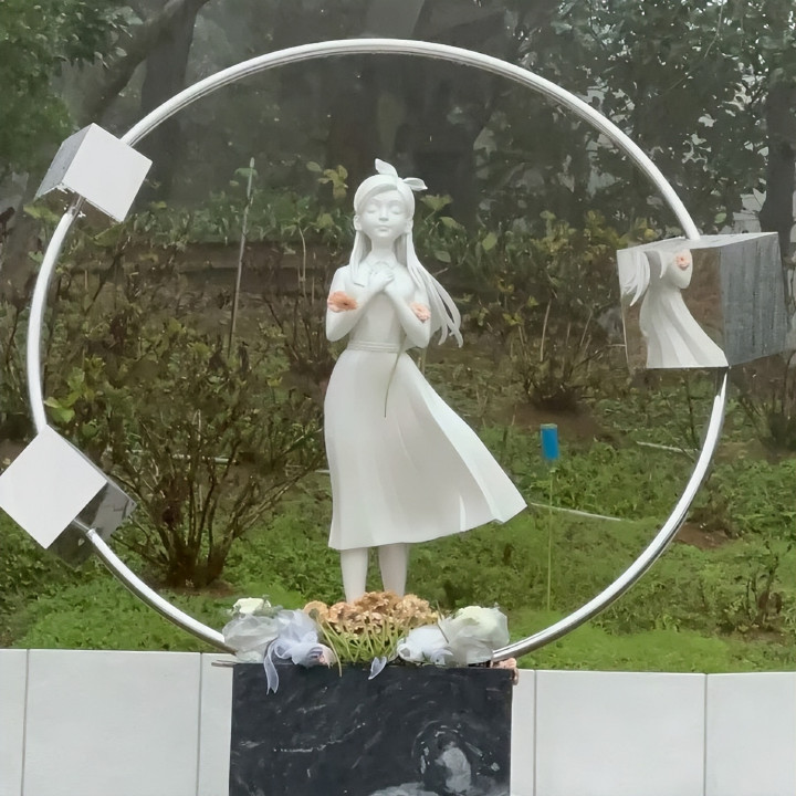 雕像是个穿着百褶裙,长发飘飘,头戴蝴蝶结的小女孩,女孩双手重叠放在胸前,紧闭双眼似乎在祈祷着什么。