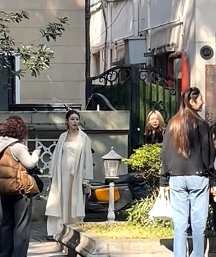 一旁马筱梅扎着高马尾,身着白色连衣裙搭配同色长款外套,一身穿搭被夸越来越有老板娘风范。