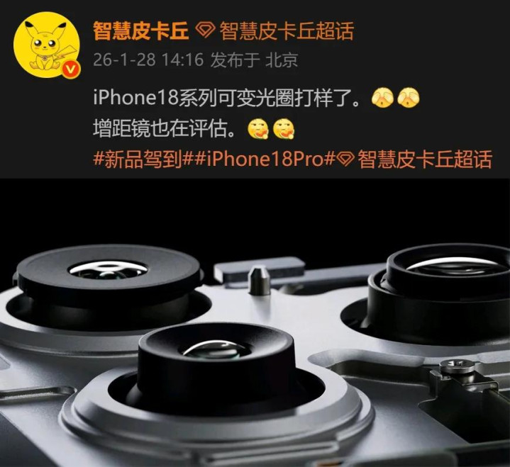 近日,澳门娱乐平台这项新设计有了更进一步的进展。据博主@智慧皮卡丘爆料,iPhone 18系列的可变光圈已进入打样阶段。