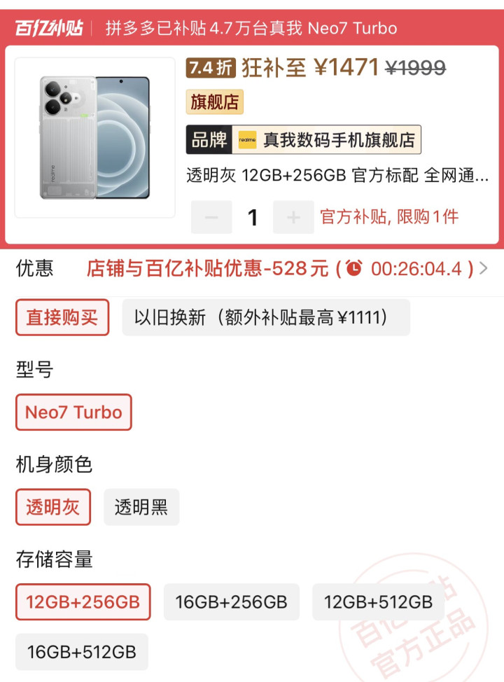 综合来看,真我Neo7 Turbo并不是那种只靠某一个卖点取胜的手机,而是在性能、屏幕、续航、影像、耐用性和体验细节上,做到了全面而均衡,它适合想要畅快玩游戏的用户、也适合对屏幕和护眼有要求的用户,更适合不想天天为电量、发热、信号操心的消费者!如果你正在找一台能陪你高强度使用、又能在日常生活中带来安心感的机型,就真我这款产品还是很值得入手,而就在价格层面也是较为亲民的存在,参考到如今电商平台中的售价情况,仅是需要1471元的价格即可入手了。