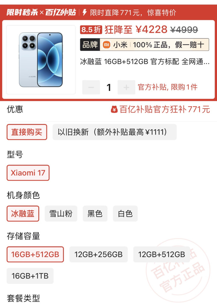 总的来说,就小米17这款机型的话,并不是那种靠一两个卖点博眼球的手机,而是一台从设计、屏幕、性能、影像到续航都打磨得相当均衡的产品,它不会强迫你在某个维度妥协,而是让你在日常使用中不断感受到“这台手机挺懂我”!如果你正在找一台尺寸适中、性能顶级、拍照在线、续航踏实,又能长期安心使用的手机,就小米这款产品绝对很值得入手,而就在价格层面也是很亲民的存在,参考到如今电商平台中的售价情况,其中16GB+512GB的内存规格则是出现了771元的大降价加持了。