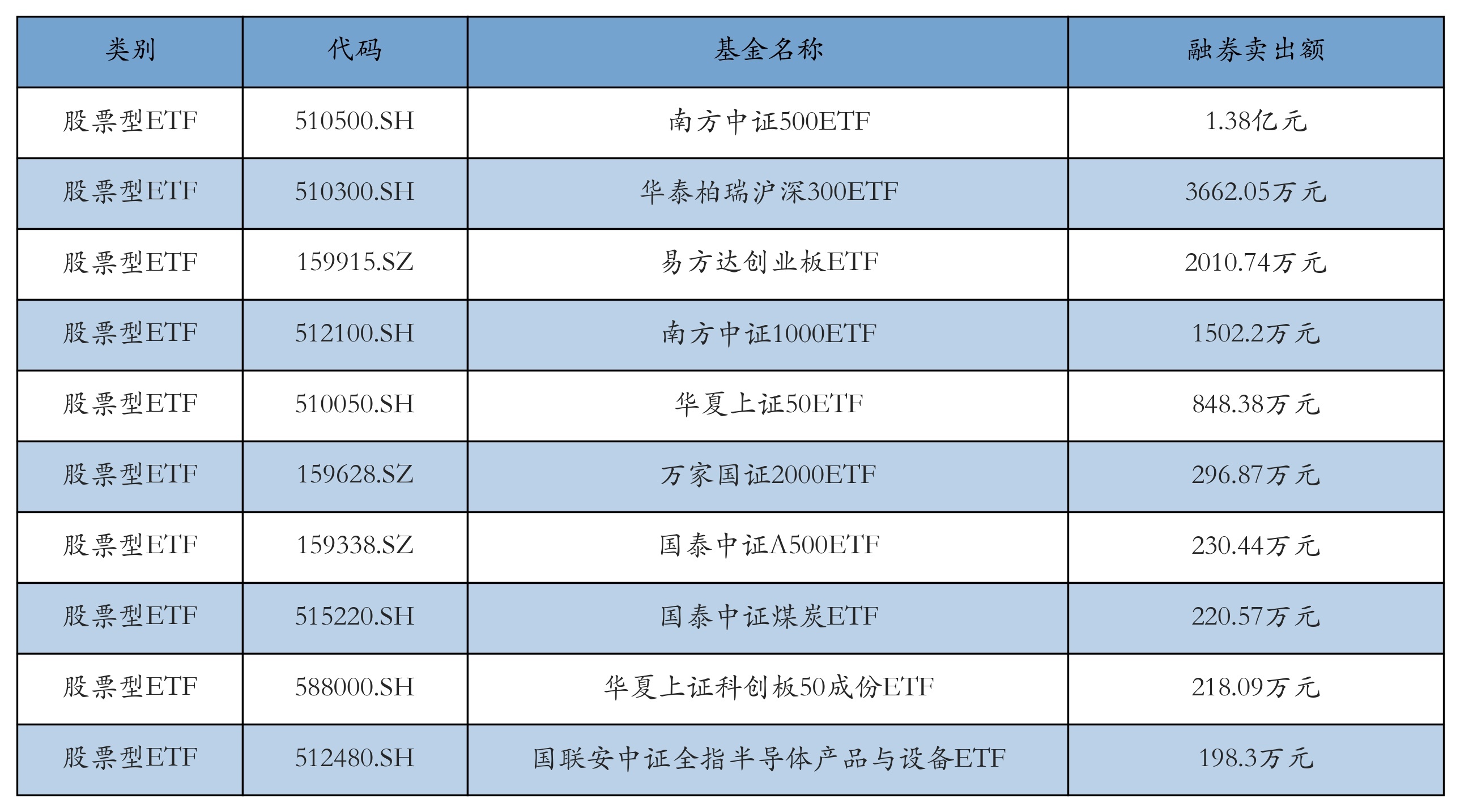 昨日股票型ETF融资卖出额最高的3只ETF偏激卖出金额分裂为:南边中证500ETF(1.38亿元)、华泰柏瑞沪深300ETF(3662.05万元)、易方达创业板ETF(2010.74万元)。融券卖出额前10折服见下表: