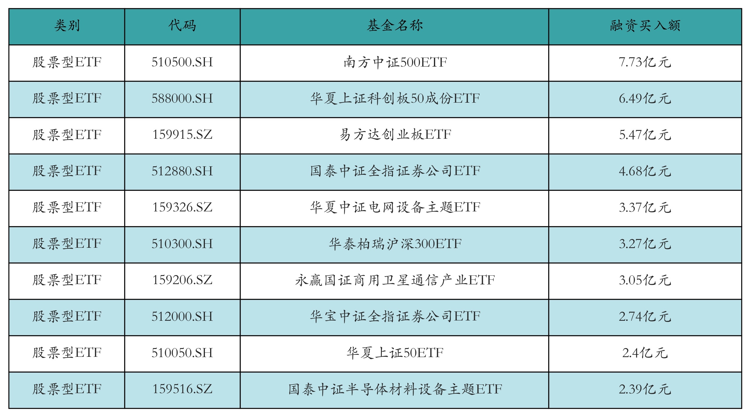 昨日股票型ETF融资买入额最高的3只ETF偏激买入金额分裂为:南边中证500ETF(7.73亿元)、中原上证科创板50成份ETF(6.49亿元)、易方达创业板ETF(5.47亿元)。融资买入额前10折服见下表: