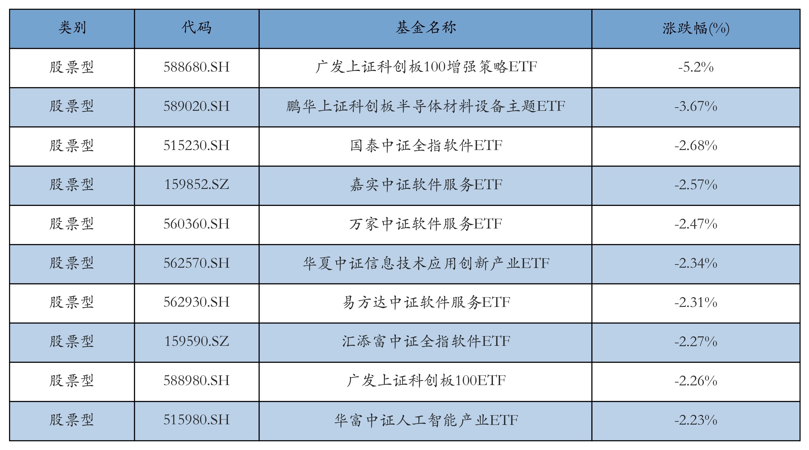 昨日股票型ETF跌幅最大的3只ETF偏激收益率分裂为:广发上证科创板100增强政策ETF(-5.2%)、鹏华上证科创板半导体材料斥田主题ETF(-3.67%)、国泰中证全指软件ETF(-2.68%)。跌幅前10折服见下表: