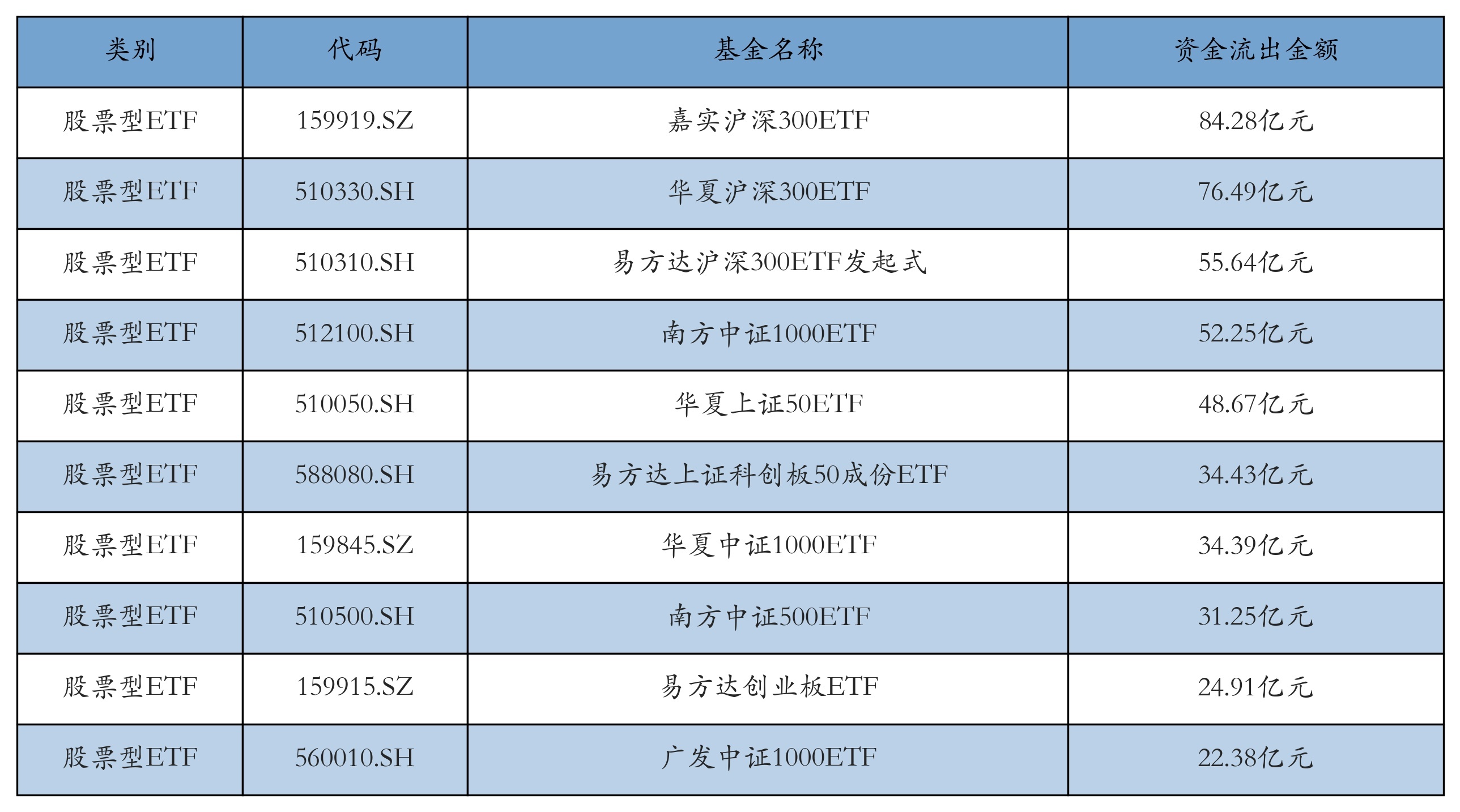 昨日股票型ETF资金流出最多的3只ETF偏激流出金额分裂为:嘉实沪深300ETF(流出84.28亿元)、中原沪深300ETF(流出76.49亿元)、易方达沪深300ETF发起式(流出55.64亿元)。资金流出前10折服见下表: