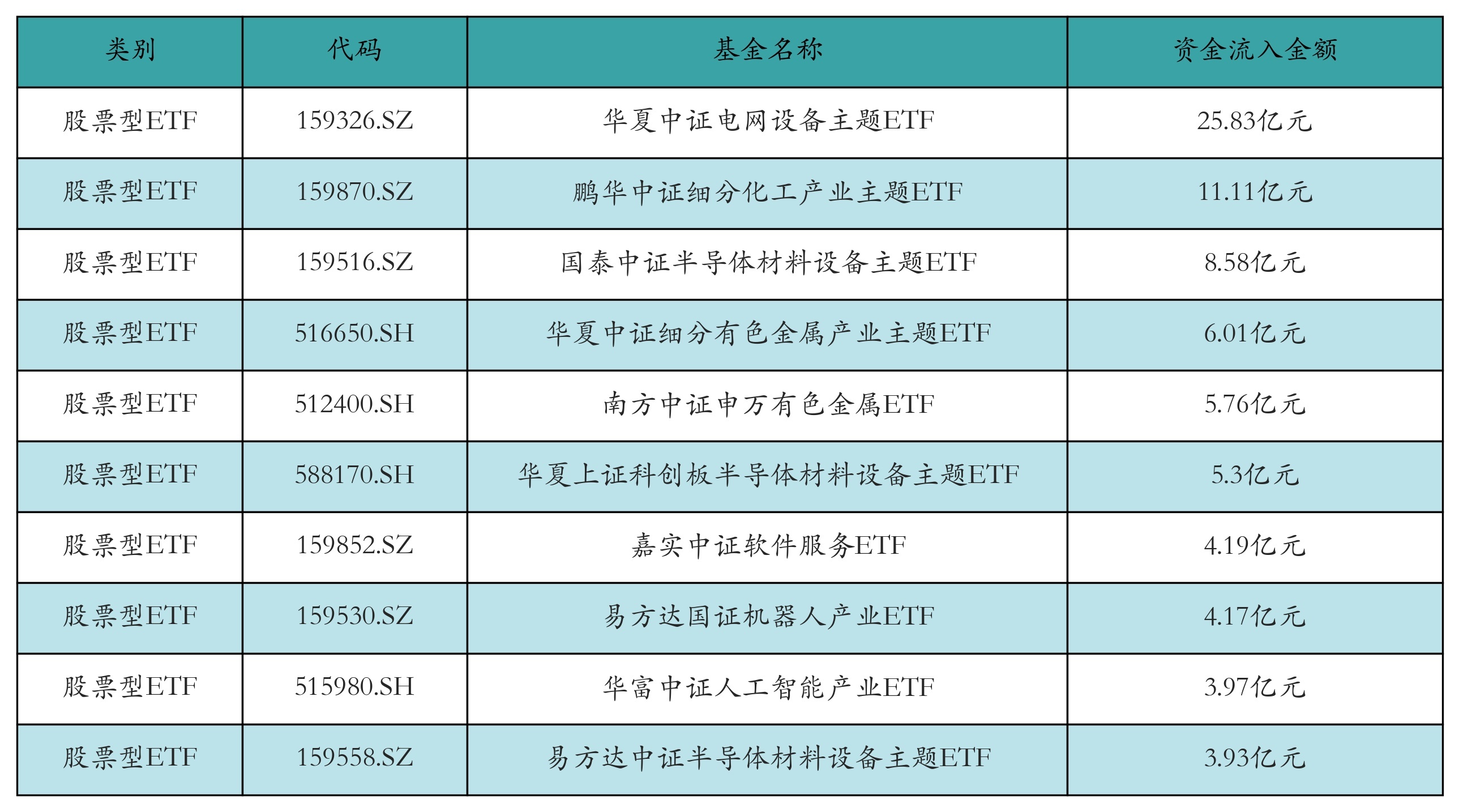 昨日股票型ETF资金流入最多的3只ETF偏激流入金额分裂为:中原中证电网斥田主题ETF(流入25.83亿元)、鹏华中证细分化工产业主题ETF(流入11.11亿元)、国泰中证半导体材料斥田主题ETF(流入8.58亿元)。资金流入前10折服见下表: