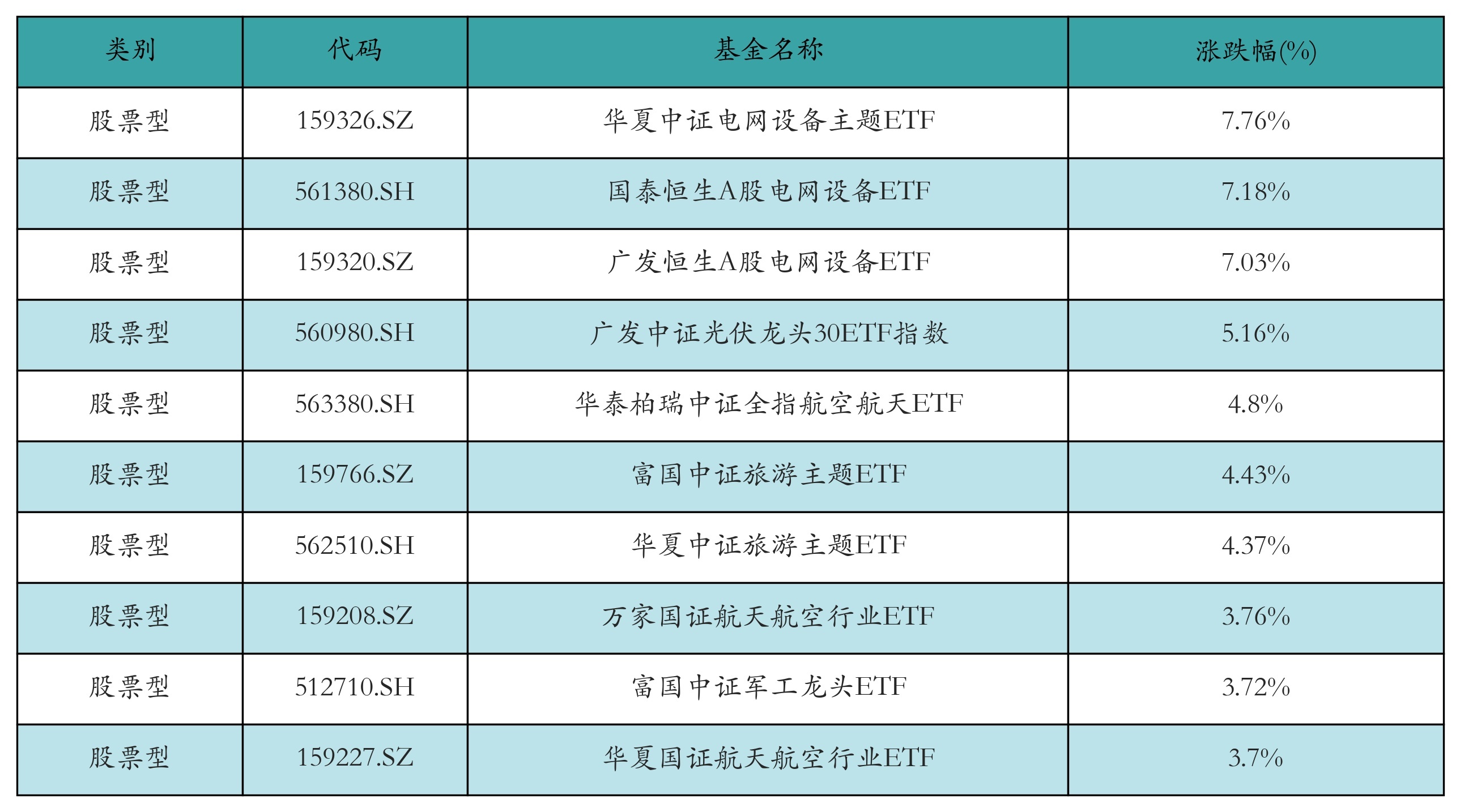 昨日股票型ETF涨幅最高的3只ETF偏激收益率分裂为:中原中证电网斥田主题ETF(7.76%)、国泰恒生A股电网斥地ETF(7.18%)、广发恒生A股电网斥地ETF(7.03%)。涨幅前10折服见下表: