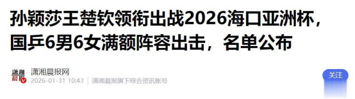 潇湘晨报——孙颖莎王楚钦领衔出战2026海口亚洲杯,国乒6男6女满额阵容出击,名单公布