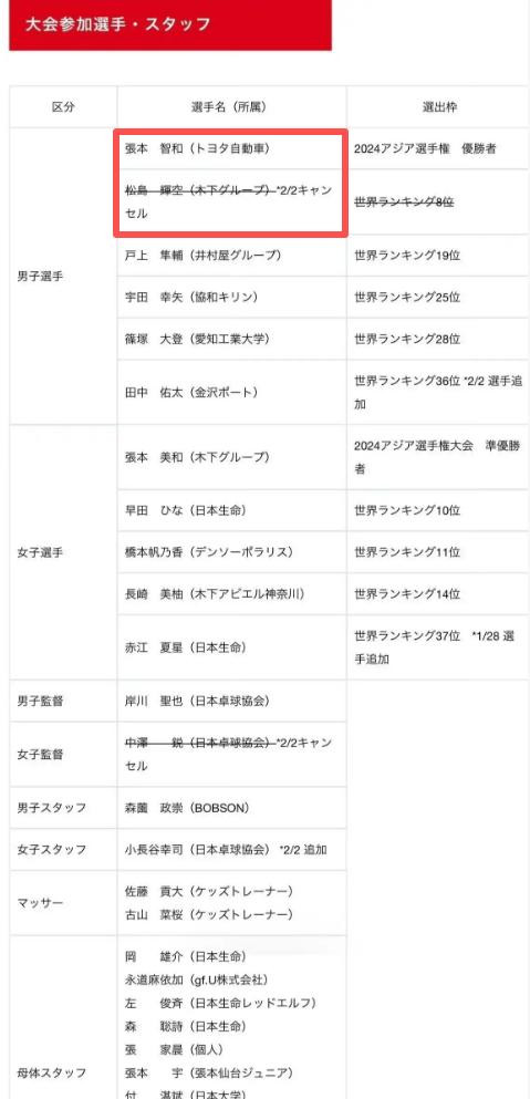 张本智和凭借2024年亚锦赛冠军身份,启用不占名额特权拿到参赛资格,让日本队参赛人数增至10人(男女各5人),打破常规8人限制。
