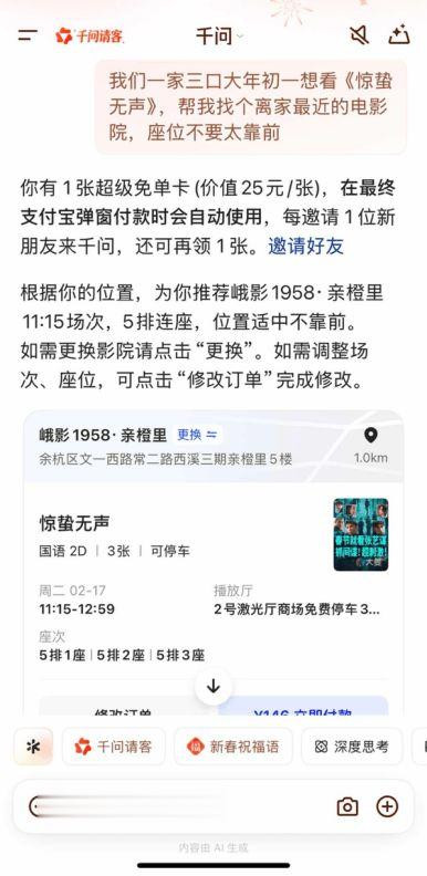2月16日,通过千问APP使用AI助手购买电影票的订单量出现权臣增长,日环比增幅达到500%。