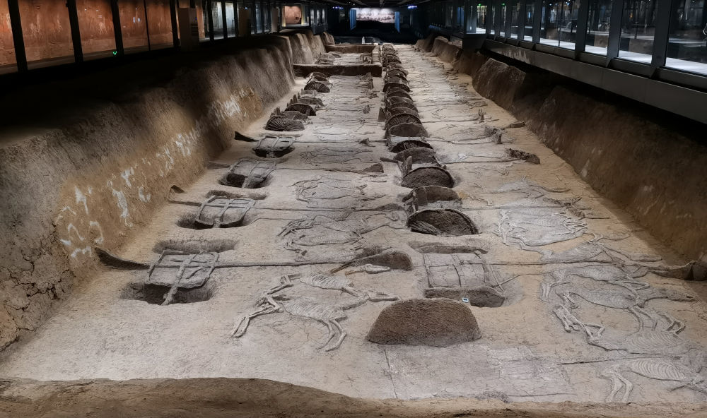 荆州熊家冢国度考古名胜公园一号车马坑出土的车马阵,阵容恢宏。新华社记者 余国庆 摄