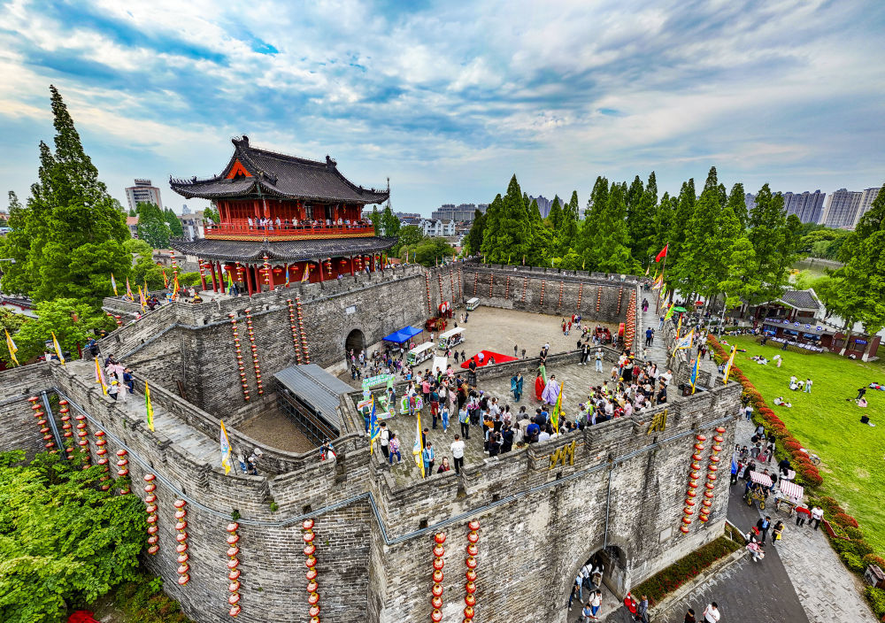 市民搭客登上荆州古城,感受古城文化魔力。(张梦瑶 摄)