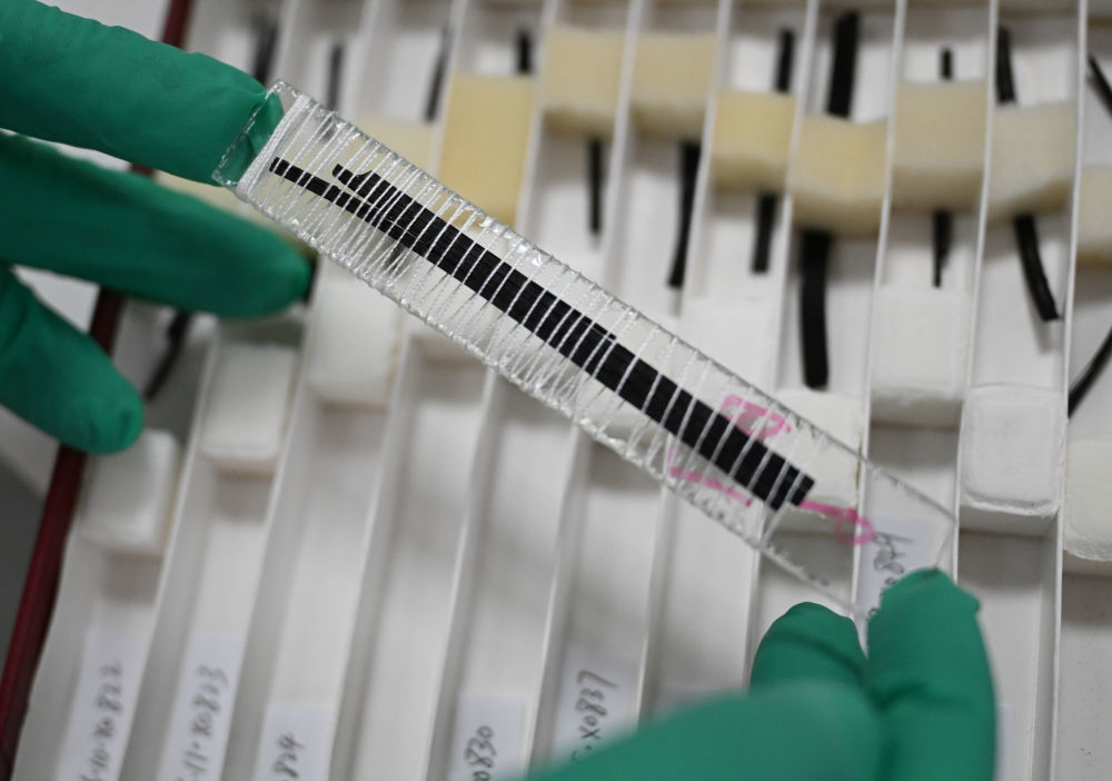荆州文物保护中心简牍职责室职责主谈主员处理竹简残片。新华社记者 程敏 摄