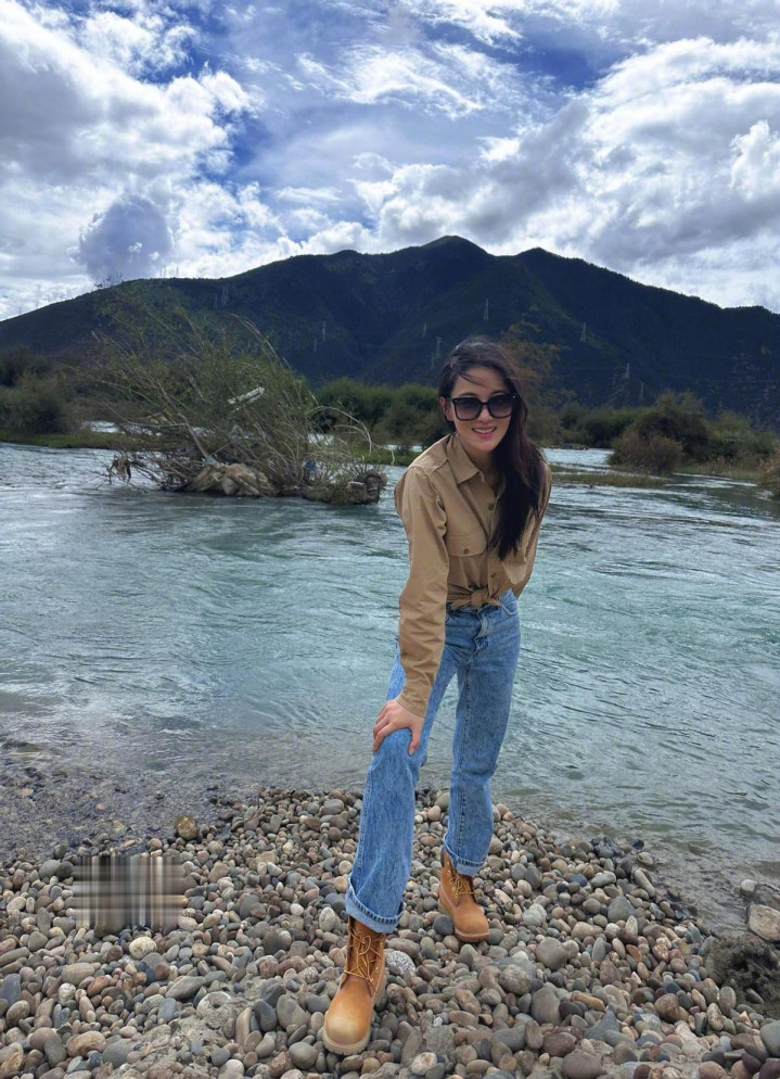 在碧水青山前,张馨予用一件卡其色工装衬衫搭配直筒牛仔裤,更是直接把户外穿搭穿成了时尚大片。卡其色衬衫的硬挺面料自带野性气质,她故意将下摆打结,露出腰线,在宽松版型中勾勒出纤细线条,保留了工装的硬朗,又添了几分柔媚。直筒牛仔裤的微喇裤型恰好遮住小腿线条,配上经典大黄靴,整套穿搭从色彩到版型都透着松弛的户外感。