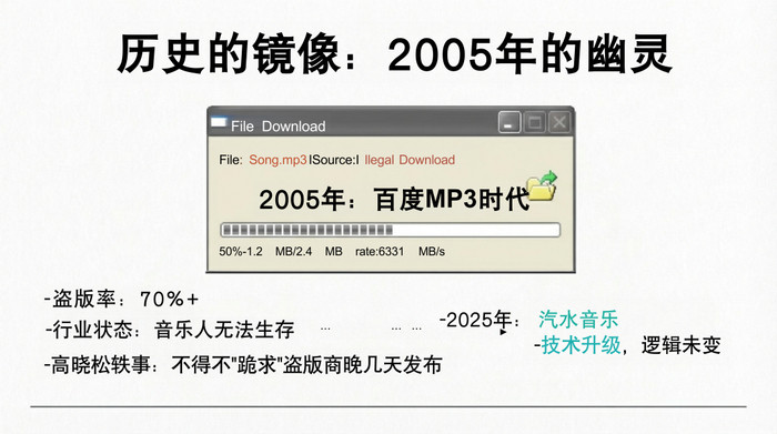 21世纪初,盗版音乐泛滥成灾。百度MP3以“免费下载任何歌曲”为卖点迅速占领市场,成为当时最大的音乐平台。那个年代,音乐人的生存状况之艰难令人难以想象。