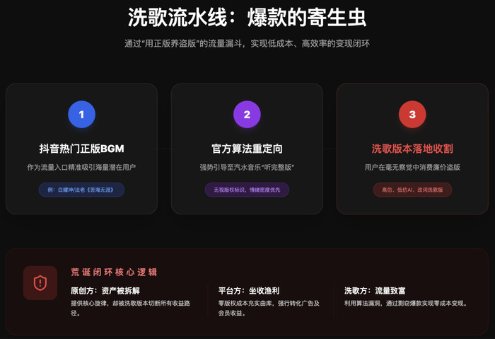 洗歌方(盗版制造者):零成本剽窃,通过蹭热度获得巨大流量。