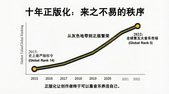 从排名靠后的“音乐盗版重灾区”到全球前五的“音乐消费大国”,十年正版化带来的是整个音乐产业的重建。