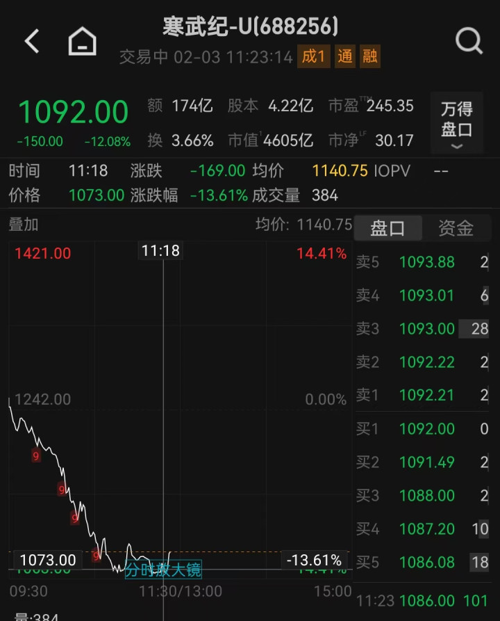 上周五晚间发布2025年业绩预告后,寒武纪(688256.SH)股价本周一下跌,今日盘中又跌超13%,市值回落到4600亿元以下。