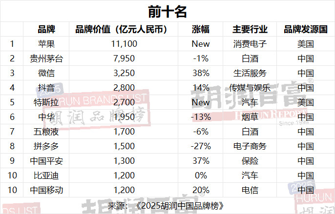 胡润研究院2月3日发布《2025胡润中国品牌榜》。这次榜单最直观的变化是,长期占据榜首的贵州茅台退居第二,而苹果公司(Apple)则以1.11万亿元人民币的品牌价值,成为新晋的榜单第一。
